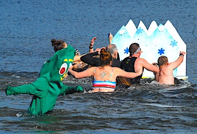 Once the horn sounds, their goal is to be the first to reach the “snowflakes” on the side of two “icebergs” floating about 50 feet out in the icy waters of a mountain lake — in the dead of winter.