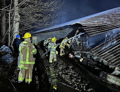 The 42’ x 400’ building on Pine Grove Farm was on fire when volunteers arrived, and the blaze was spreading toward both ends of the poultry house. Firefighters were able to contain the fire to that area and get it under control within 30 minutes.