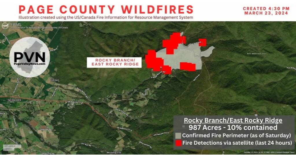 LURAY, March 23 — While the Rocky Ridge wildfire in Shenandoah National Park has spread to 1,000 acres and is 10 percent contained, the Route 211 West fire has seen smaller fires merge as it has now scorched more 5,000 acres and is 50 percent contained, according to the Virginia Department of Forestry.