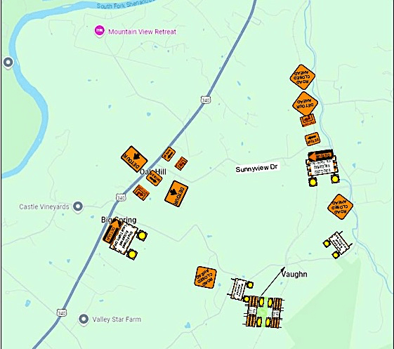 As the map below shows, there will be warning signs to those turning off Route 340 onto Vaughn Summit Road (just south of the recycling center and Springfield Elementary) and Sunnyview Drive (just north of Springfield Elementary). There will also be signage on Vaughn Summit Road near the construction site at the railroad crossing.