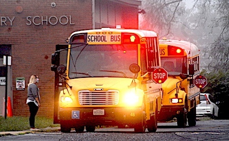 LURAY, Sept. 13 — The cloudy, foggy setting seemed eerily fitting on Thursday morning as students disembarked from buses cloaked in masks. They were met by teachers and administrators offering welcoming and inspiring remarks through their own facial coverings. They were then lead into a building with cautionary signs on the walls, directional arrows on the floors and rooms half-full of masked people.